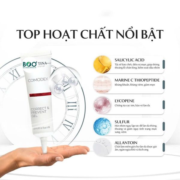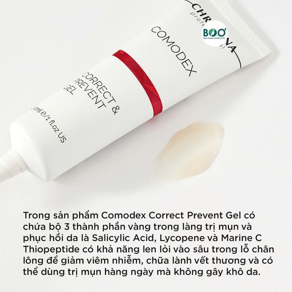 Nếu bạn đang loay hoay với mụn viêm, mụn mủ, vùng da sưng đỏ thì tuýp chấm mụn Christina Comodex Correct & Prevent Gel chính là “trợ thủ đắc lực” mà bạn không thể bỏ qua. Sản phẩm chứa bộ 3 thành phần vàng trong làng trị mụn: Salicylic Acid, Lycopene và Marine C Thiopeptide, giúp len lỏi sâu trong lỗ chân lông, giảm viêm, làm lành vết thương và ngăn mụn tái phát.