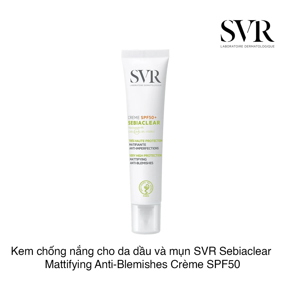Kem Chống Nắng SVR Sebiaclear Creme SPF50+ công thức mới từ thương hiệu Laboratoire SVR giúp bảo vệ và khắc phục các khuyết điểm dành cho da dầu, mụn. Sản phẩm giúp kềm dầu, làm giảm các tác hại của tia UV lên da để ngăn ngừa tăng sinh nhân mụn và vết thâm.