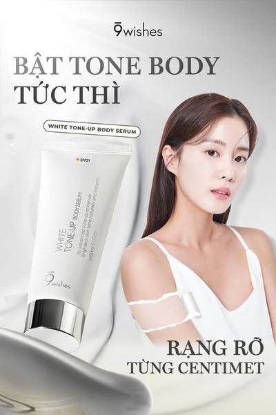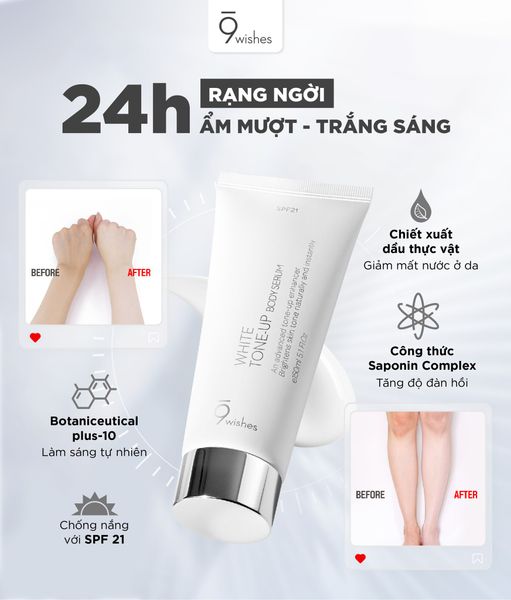 9 Wishes White Tone-Up Body Serum là kem dưỡng thể với kết cấu mỏng nhẹ, tựa serum, giúp làm sáng da, nâng tone da tự nhiên, đồng thời cung cấp độ ẩm sâu, tăng độ đàn hồi, thích hợp sử dụng hàng ngày. Sản phẩm còn chứa SPF21 giúp bảo vệ da khỏi tác hại của tia UV từ ánh sáng mặt trời. Thành phần tự nhiên, lành tính, phù hợp với mọi loại da, kể cả da nhạy cảm.