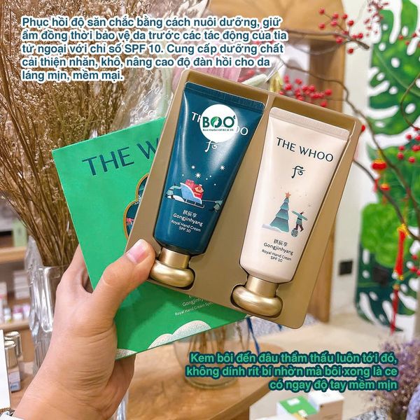Kem dưỡng da tay Whoo Gongjinhyang Hand Cream SPF10 là dòng sản phẩm Đông y cao cấp thuộc thương hiệu The History of Whoo, mang công thức phục hồi da tay khô nứt, thiếu ẩm và lão hóa sớm.