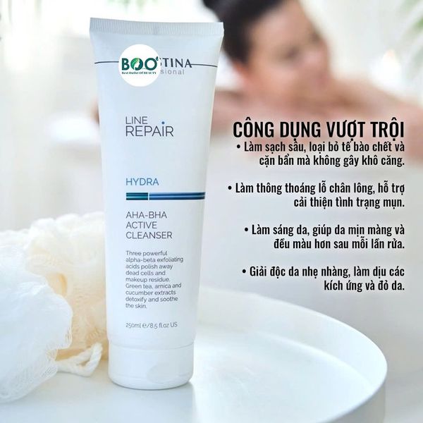 Repair Hydra AHA-BHA Active Cleanser là sữa rửa mặt làm sạch sâu có chứa AHA-BHA, được thiết kế để làm sạch triệt để cho làn da. Thành phần AHA giúp tẩy tế bào chết khỏi lớp sừng, BHA thâm nhập vào tận sâu lỗ chân lông, giải phóng tế bào chết và bã nhờn tích tụ ở đó. Chiết xuất chống viêm làm dịu, trong khi trà xanh giải độc và bảo vệ da ngay trong bước làm sạch. Làn da sáng, sạch và mềm mại ngay sau khi sử dụng.