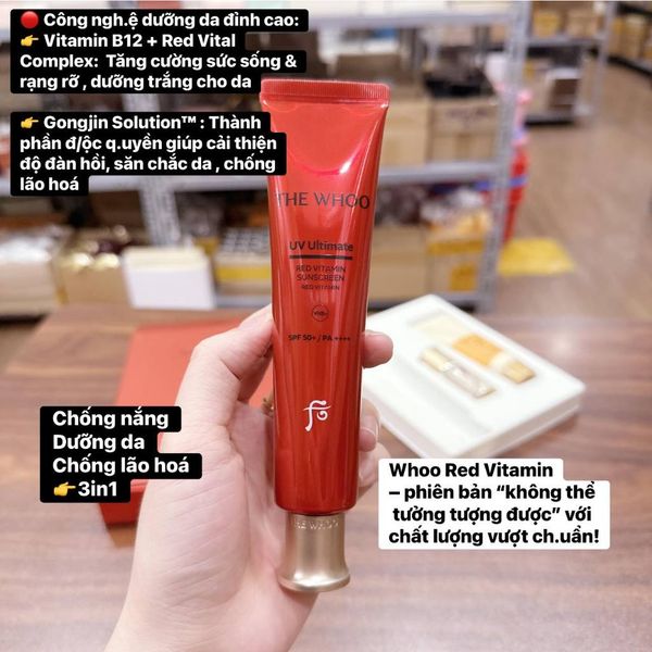 Tinh chất chống nắng The History of Whoo UV Ultimate Red Vitamin Sunscreen SE là dòng chống nắng – chống oxy hóa cao cấp, ứng dụng Red Vital Complex™ giúp làm dịu da, phục hồi và tăng độ săn chắc cho làn da bị lão hóa do ánh sáng. Kết cấu dạng serum mỏng nhẹ, phù hợp sử dụng hằng ngày như một lớp màng bảo vệ và dưỡng da toàn diện.